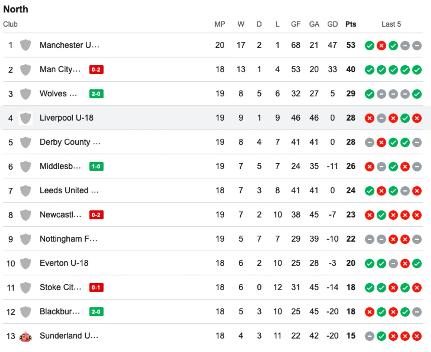 «Красные дьяволы» с огромным преимущество лидируют в Северном дивизионе, тогда как «Ливерпуль» занимает лишь четвертое место.