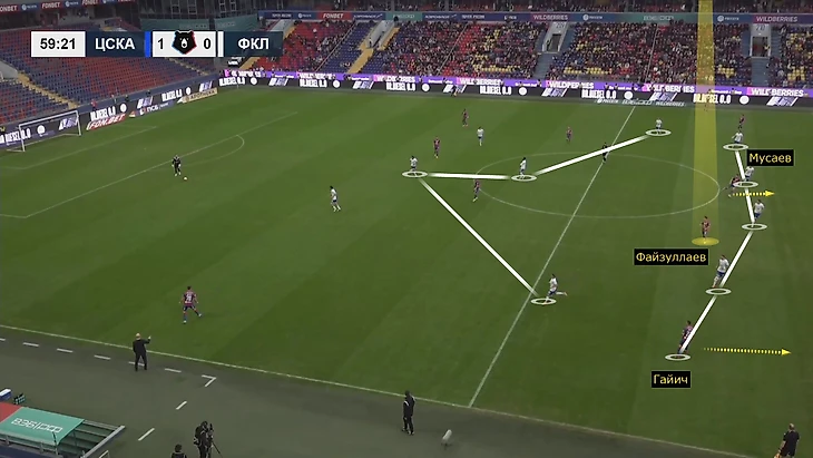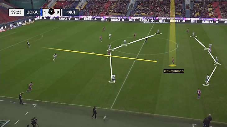 «Факел» классически прессинговал ЦСКА в 4-4-2. Ключевая проблема: центральные полузащитники Ираклий Квеквескири и Абдулла Багамаев поднимались к Саше Здьелару и Ивану Облякову, а вот защитники не выдергивались за спускающимися Виктором Давилой и Аббосом Файзуллаевым. Это образовывало большие разрывы.