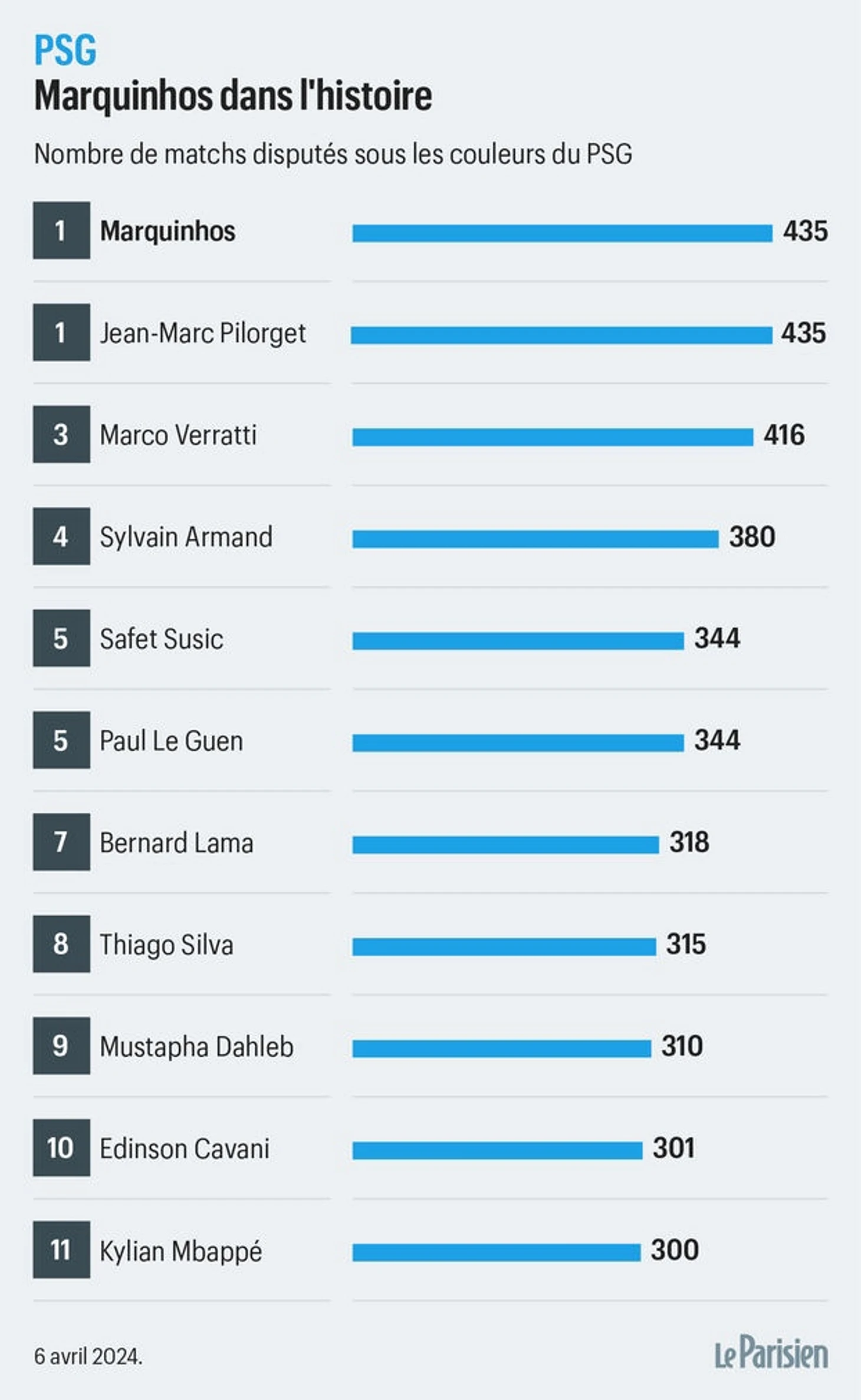 Вот как выглядит топ футболистов, на счету которых наибольшее количество игр в футболке «ПСЖ».
