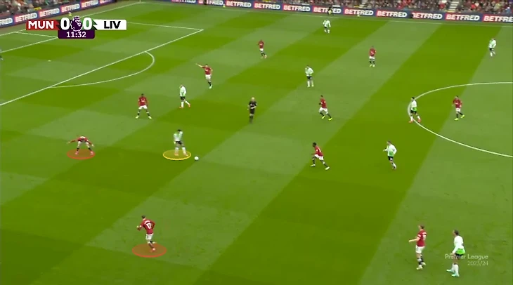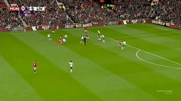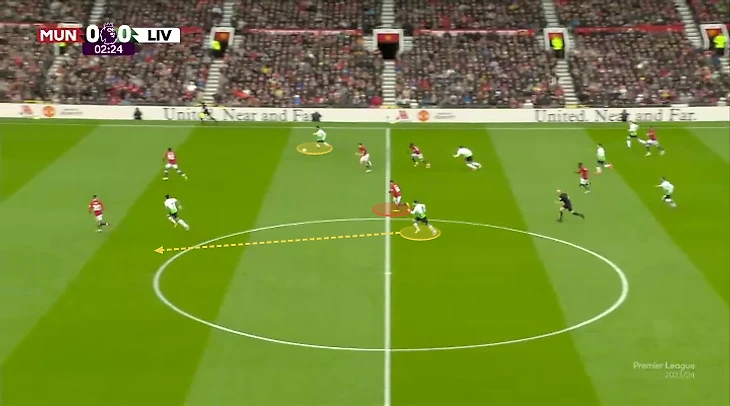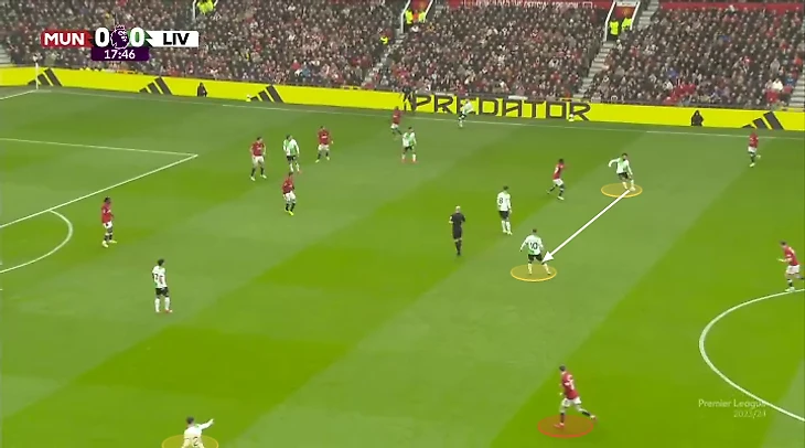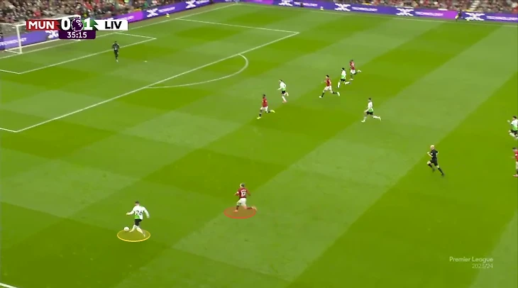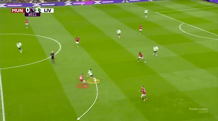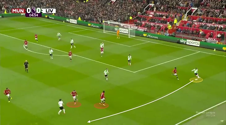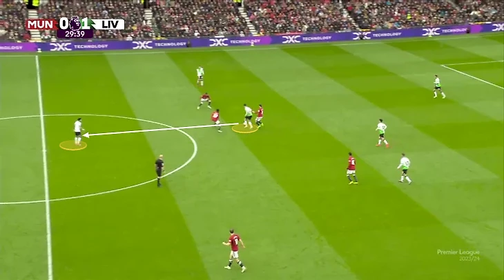 Большинство проблем «Юнайтед» было связано именно с этими вопросами. Когда вратарь Куивин Келлехер отдает мяч на Джарелла Куансу, Каземиро и Кобби Майну пытаются закрыть центральных полузащитников «Ливерпуля» Ватару Эндо и Алексиса Мак Аллистера. Это значит, что им придется следовать за ними и в обратном направлении. Но Майну отключается, его уносит в сторону мяча, а Мак Аллистер убегает от него и тот оказывается позади. Куанса направляет мяч в его сторону, и если бы Мак Аллистер чуть лучше принял мяч грудью, он мог бы пробить. Для «Ливерпуля» это было невероятно легко.