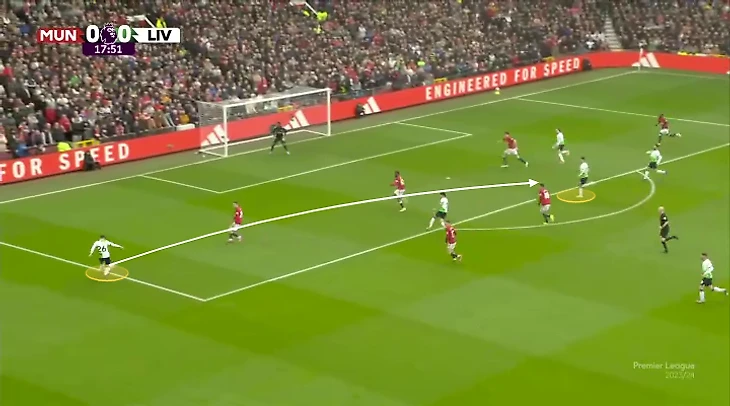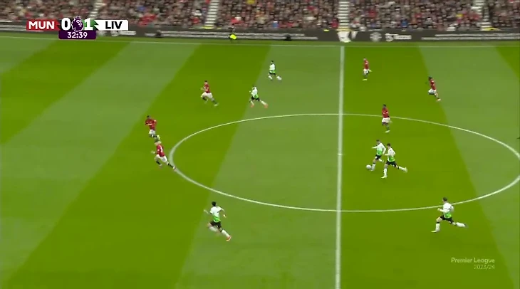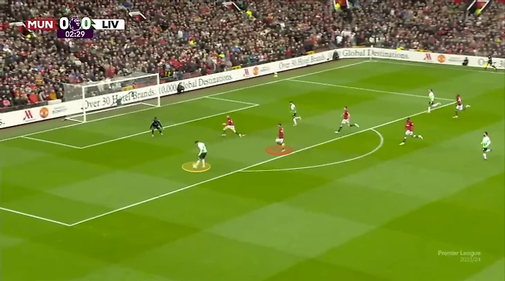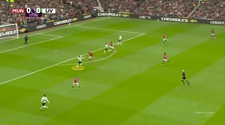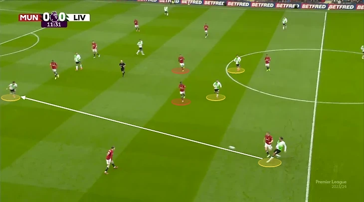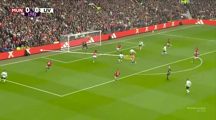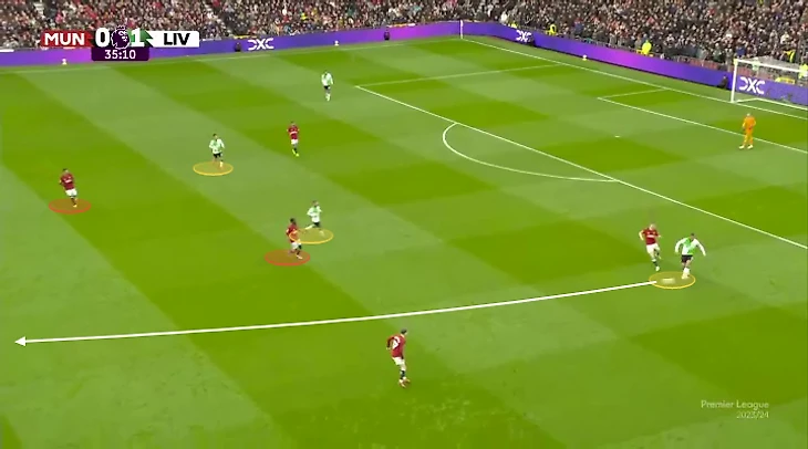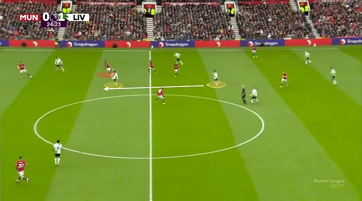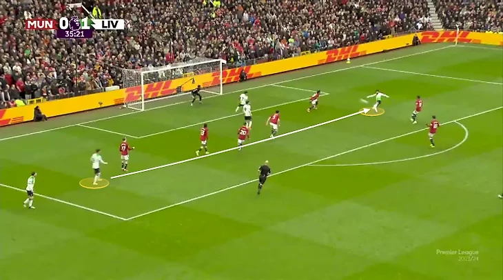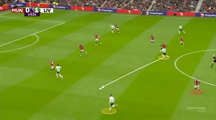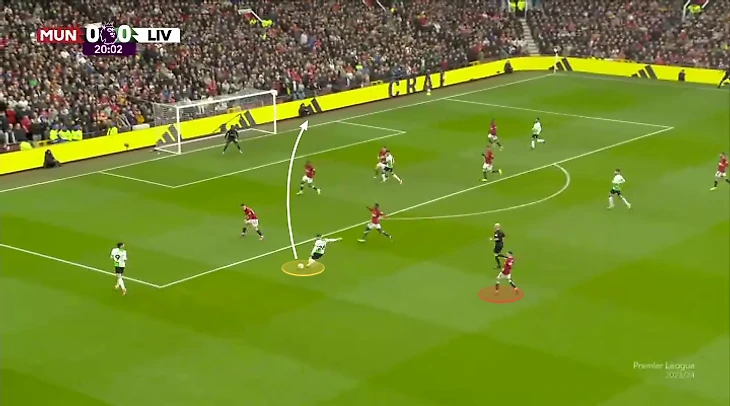 Такие прострелы в центр постоянно создают проблемы «Юнайтед» в этом сезоне. В следующем инциденте им все сошло с рук в несколько ироничной манере — проблема возникла из-за того, что Камбваля рванул вперед, а затем потерял мяч, позволив «Ливерпулю» выйти в контратаку. Кросс Диаса предназначался Собослаи, но его отбил восстановивший позицию Камвбаля, который лишь случайно оказался в правильной позиции, потому что изначально был не в своей тарелке.