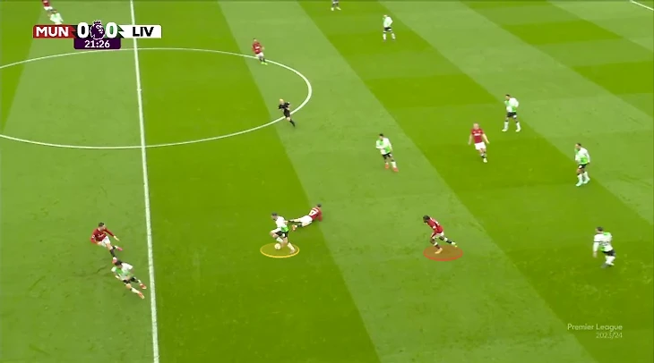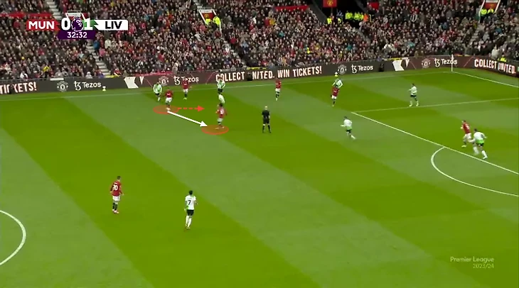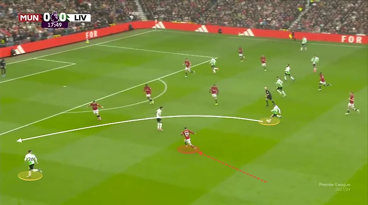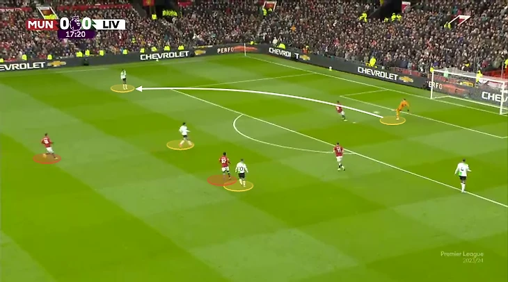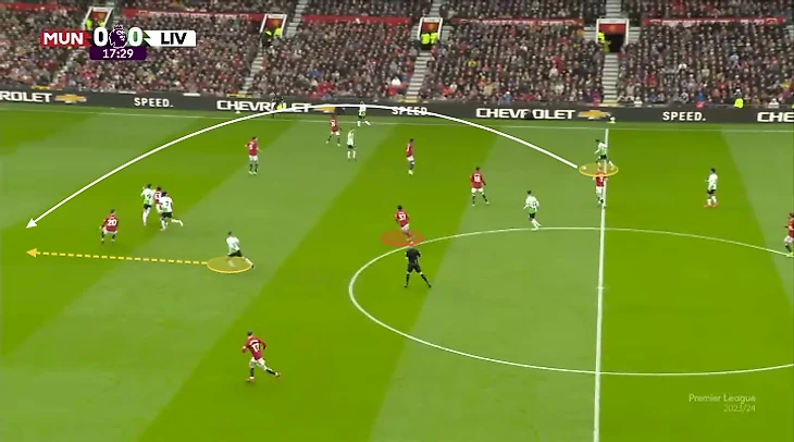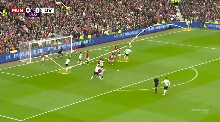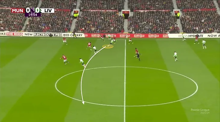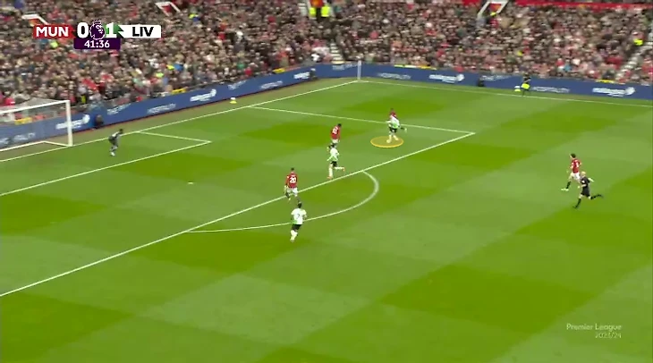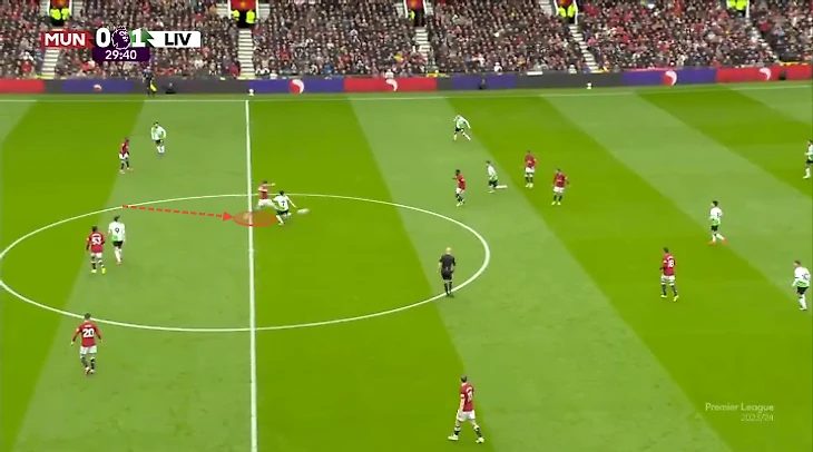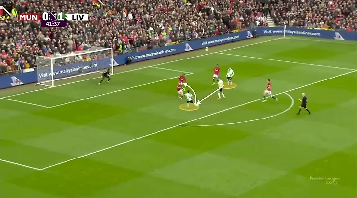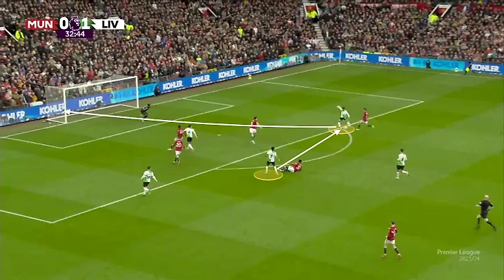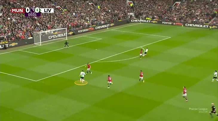 Такие прострелы в центр постоянно создают проблемы «Юнайтед» в этом сезоне. В следующем инциденте им все сошло с рук в несколько ироничной манере — проблема возникла из-за того, что Камбваля рванул вперед, а затем потерял мяч, позволив «Ливерпулю» выйти в контратаку. Кросс Диаса предназначался Собослаи, но его отбил восстановивший позицию Камвбаля, который лишь случайно оказался в правильной позиции, потому что изначально был не в своей тарелке.