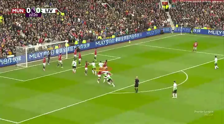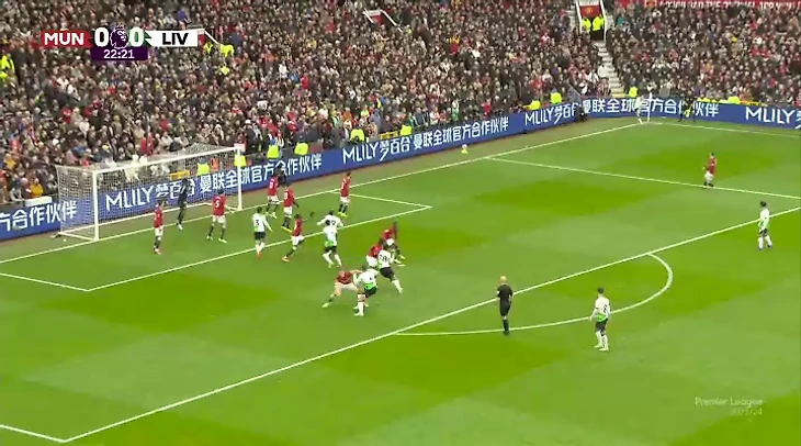 Единственный промах «Юнайтед» в первом тайме был сделан со стандарта. Трудно понять, в чем заключался их план. Майну изначально находится рядом с игроком, забившим гол, Диасом, при подаче углового. Но, похоже, он его не опекает — на самом деле его работа заключается в том, чтобы блокировать игроков «Ливерпуля», расположенных дальше.
