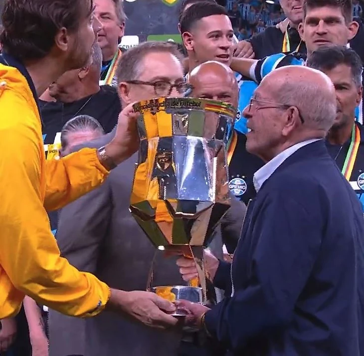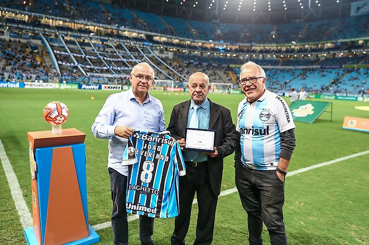 В 1962-1968 годах такой игрок был один – полузащитник Жоао Севериану или как его называли Жоаозиньо. Это именно он на фото выше вручает трофей защитнику и капитану Гремио Педро Жеромелу, который стал сейчас вторым таким игроком. Очень символично получилось.