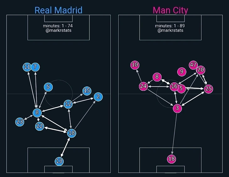 ● Анчелотти перевел Родриго на левый фланг и оставил Винисиуса в высокой позиции. Фактически, «Реал» сдвоил фланг. Это оказалось тонким тактическим ходом против Пепа, который за всю игру так и не придумал полностью рабочего способа сдержать перегрузы на этом фланге. Вини и Родриго слишком часто менялись позициями, игрокам обороны было трудно «передавать» их друг другу. Данный тактический ход позволил «Реалу» постоянно генерировать угрозу через рывки и комбинации двух бразильцев. «Сити» явно не готовился к такому варианту игры. Прямо или косвенно данный ход, вкупе с хорошо поставленным выходом из обороны в атаку, привел к 5 ударам «Мадрида» из-за пределов штрафной площади, чего «Сити» ни разу не допускал при Гвардиоле в противостояниях с «Реалом».