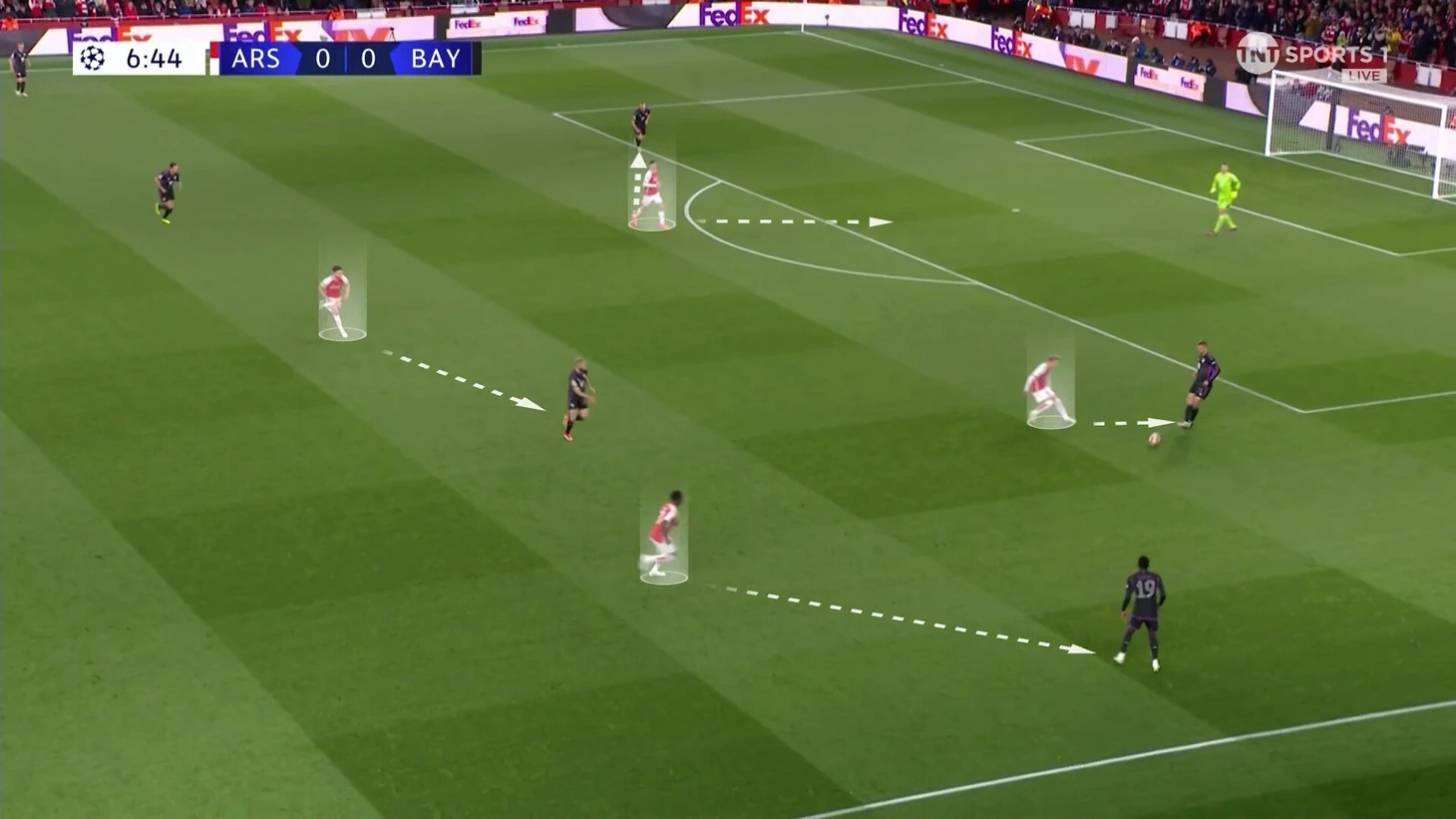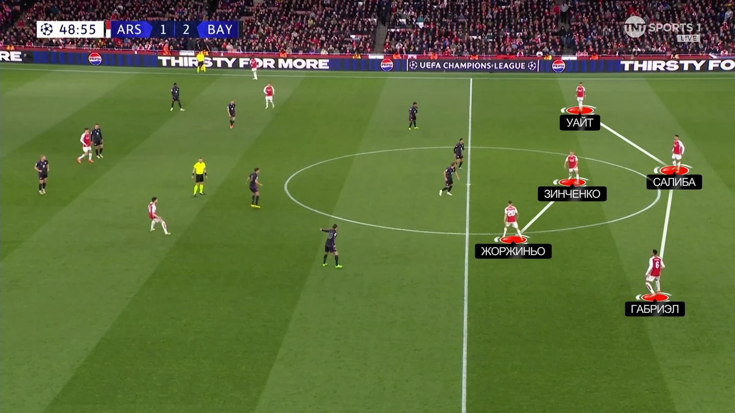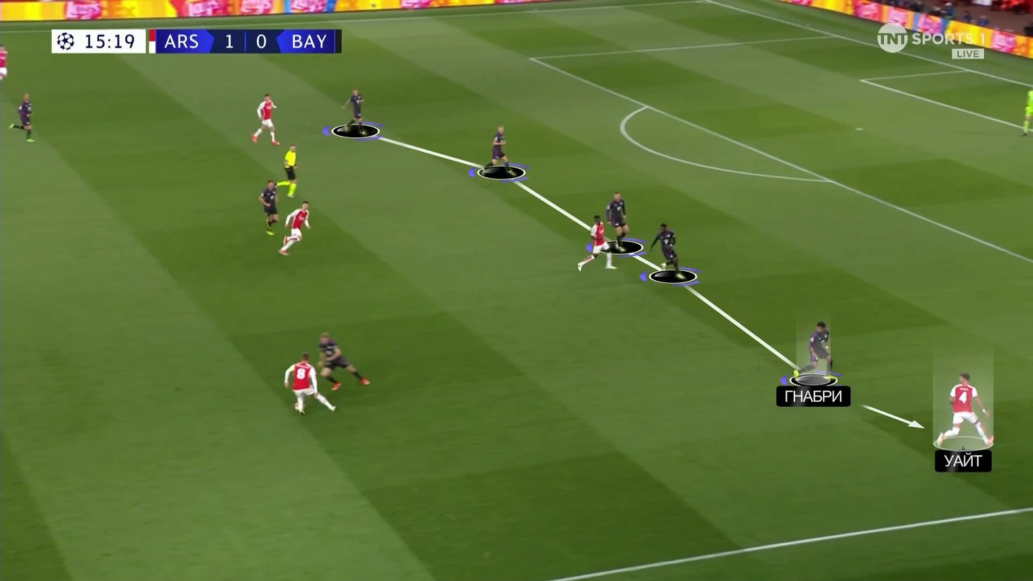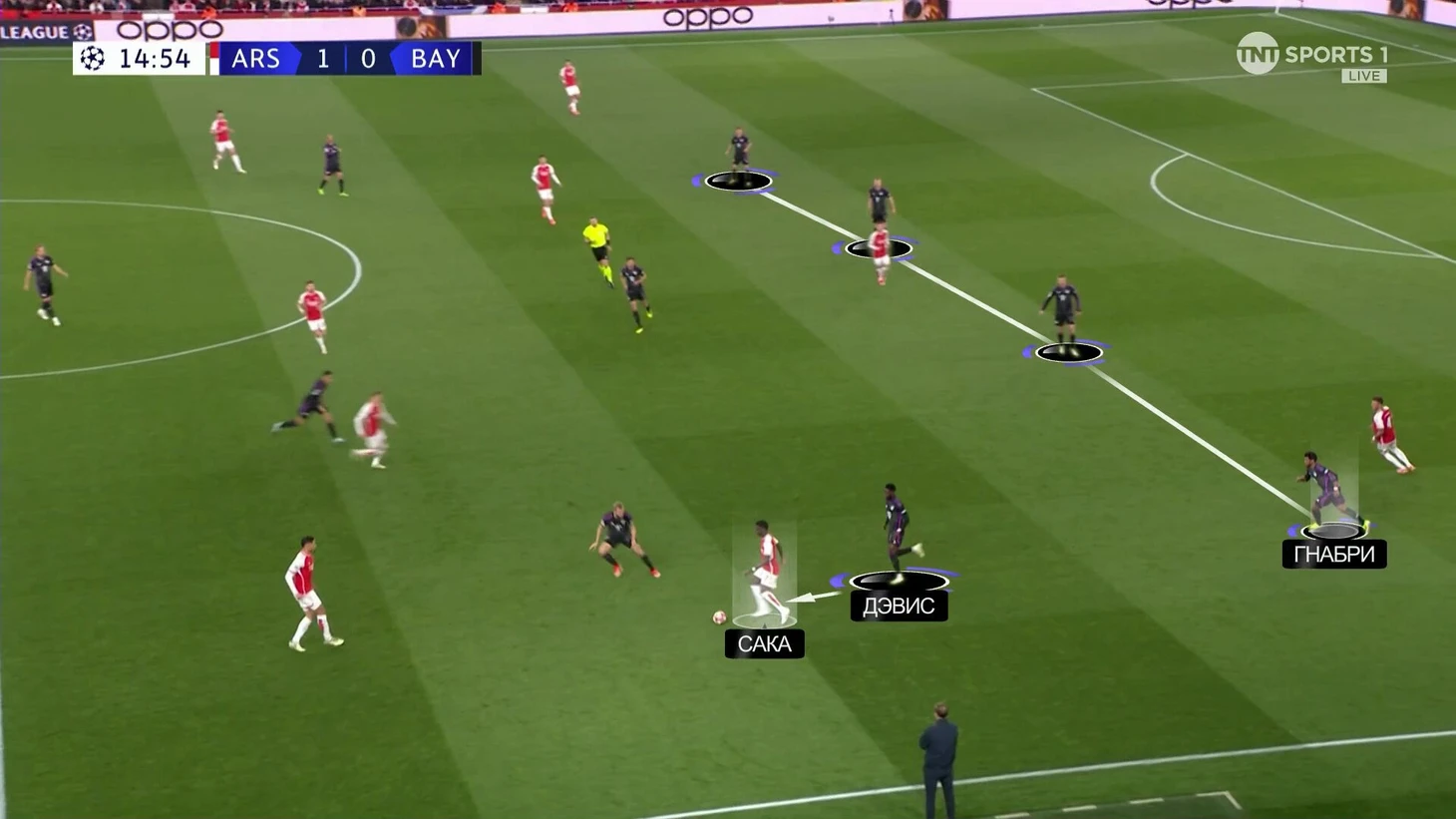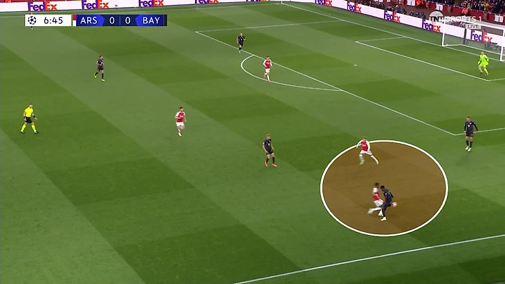 Эта схема сдерживания не очень работала. Дэвис получил раннюю желтую именно на Букайо. «Арсенал» регулярно заходил через эту зону. «Бавария» сильно прибавила, когда отказалась от чистых персоналок и стала действовать с передачей игроков.