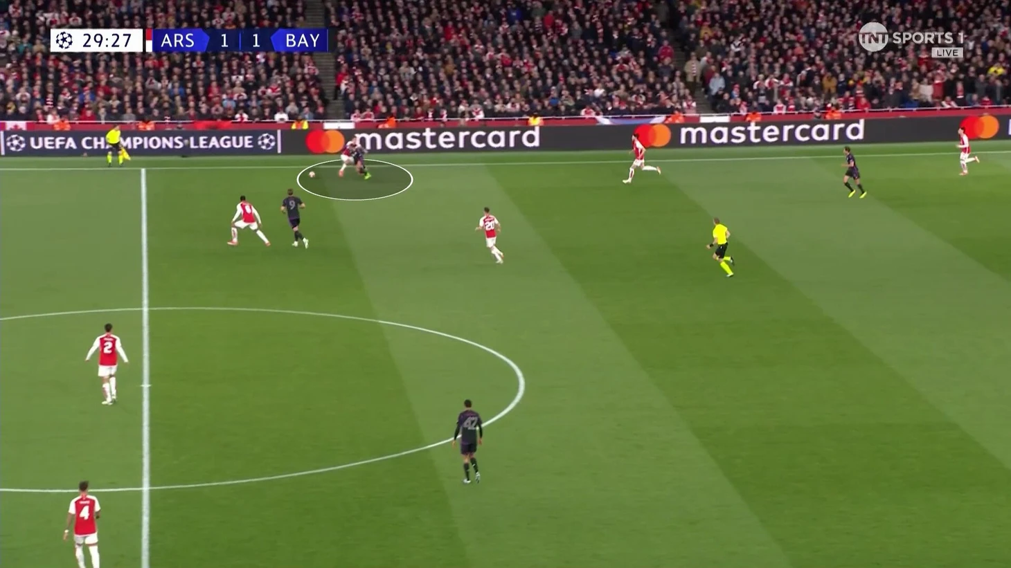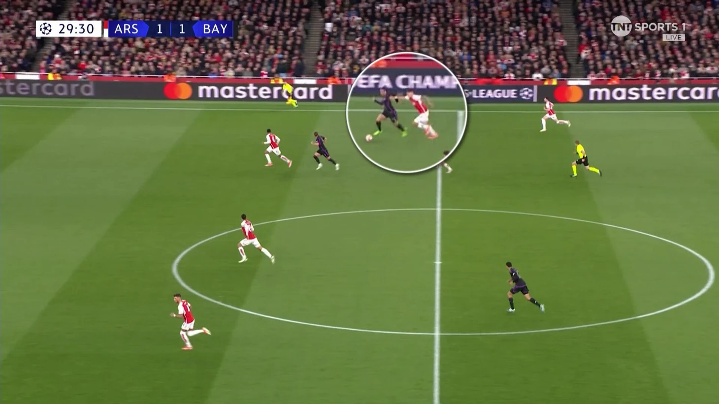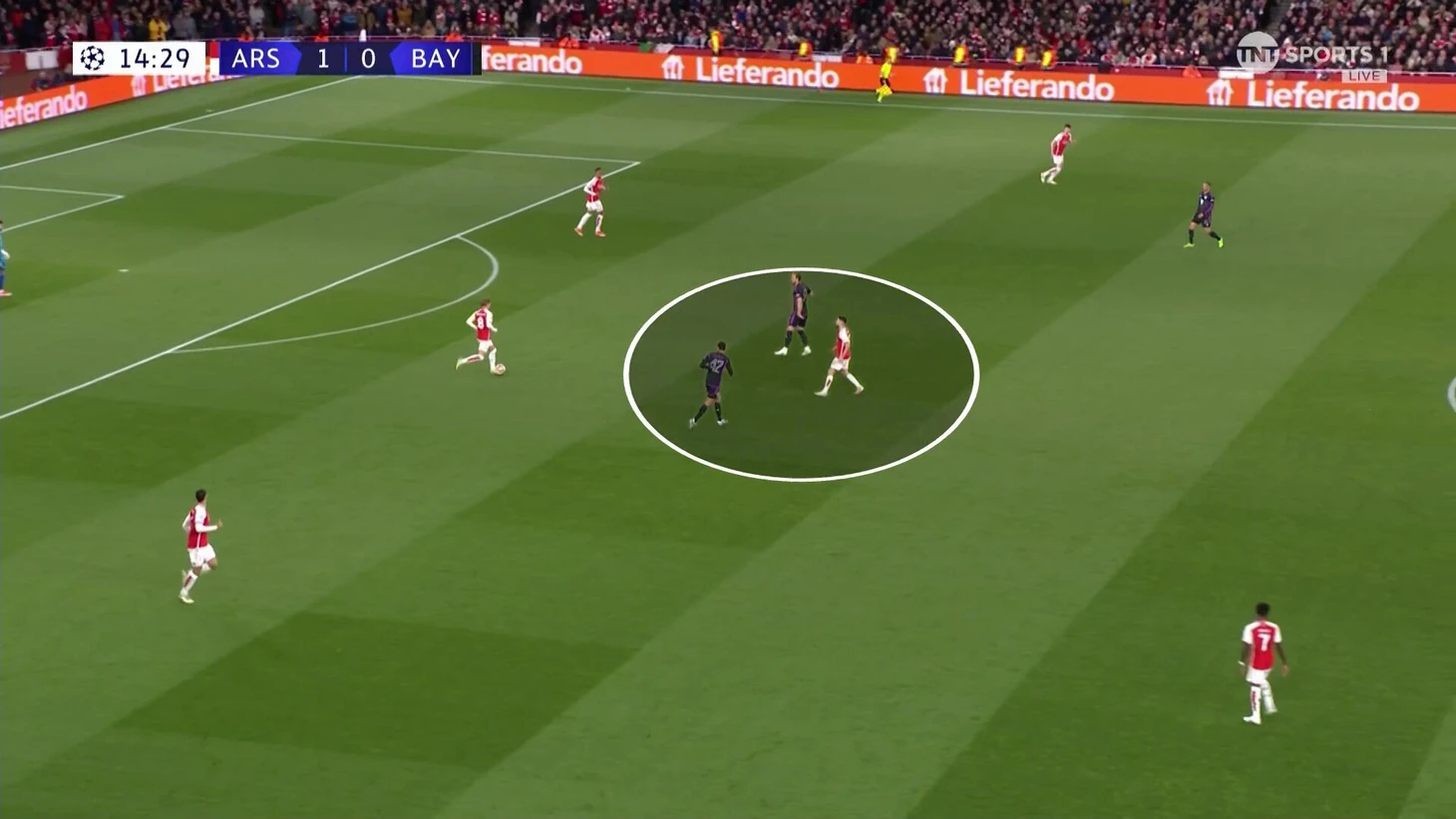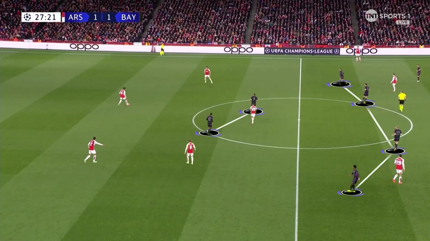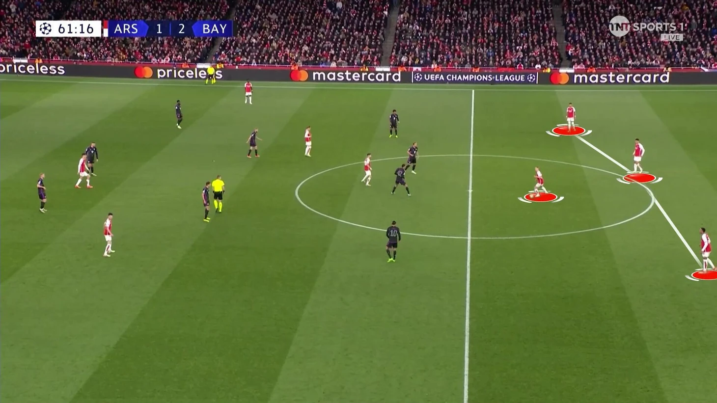 Эта схема сдерживания не очень работала. Дэвис получил раннюю желтую именно на Букайо. «Арсенал» регулярно заходил через эту зону. «Бавария» сильно прибавила, когда отказалась от чистых персоналок и стала действовать с передачей игроков.