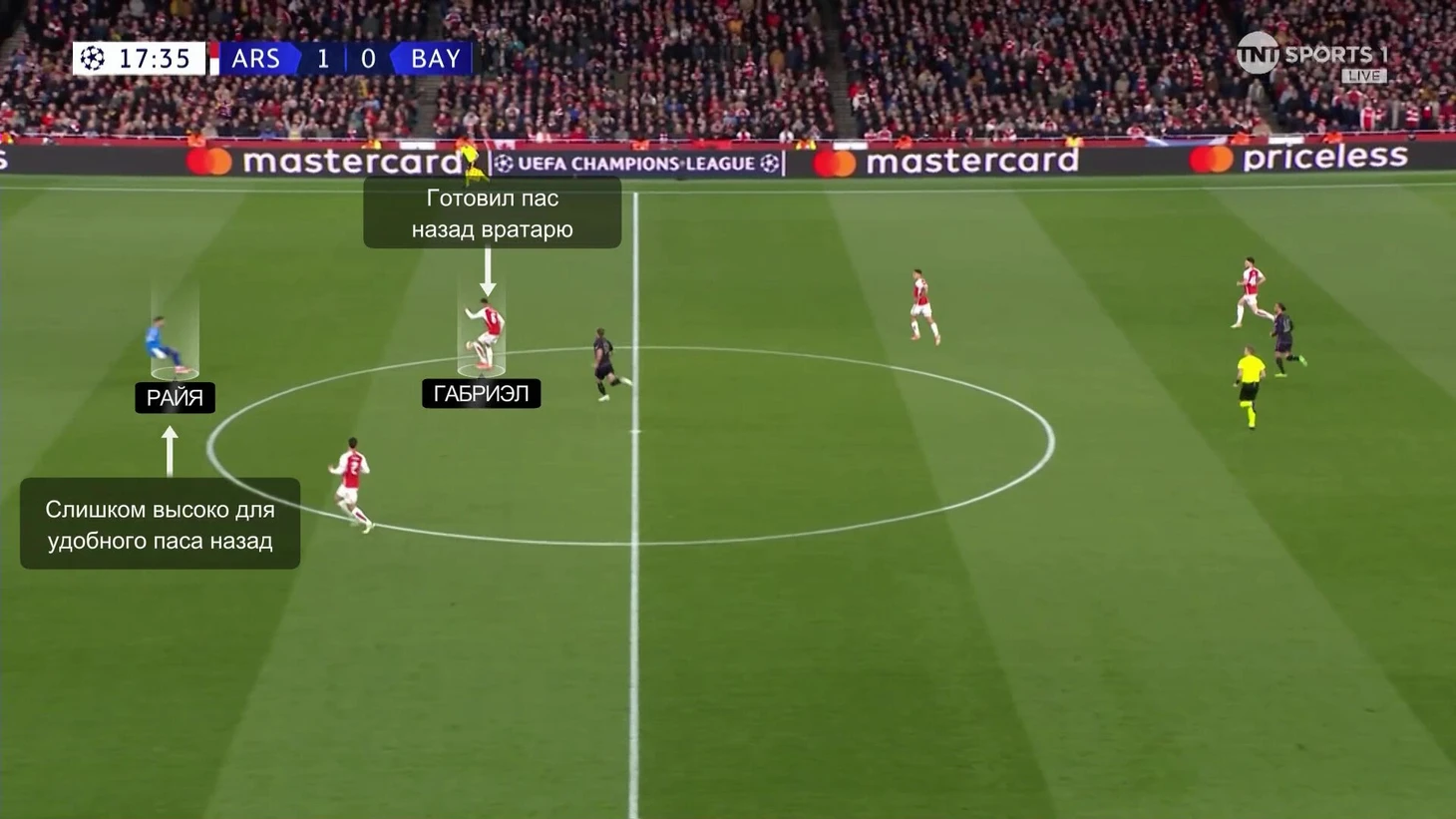 В первом случае все началось с недопонимания между Райей и Габриэлом. Вратарь слишком высоко поднялся и лишил защитника опции для паса назад. Габриэлу пришлось менять решение под давлением Кейна – получился неточный пас: