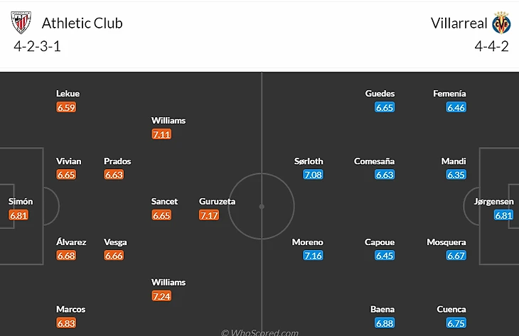 Непонятно смогут ли хозяева восстановить дееспособность к воскресенью (особенно не до конца здоровые Йерай Альварес(5,5), Весга(6,5) и Иньяки Уильямс(8)) и самым продуманным тут смотрится Руис Де Галаррета(6), который заблаговременно набрал желтых карточек и может без палева проспаться в выходные.
