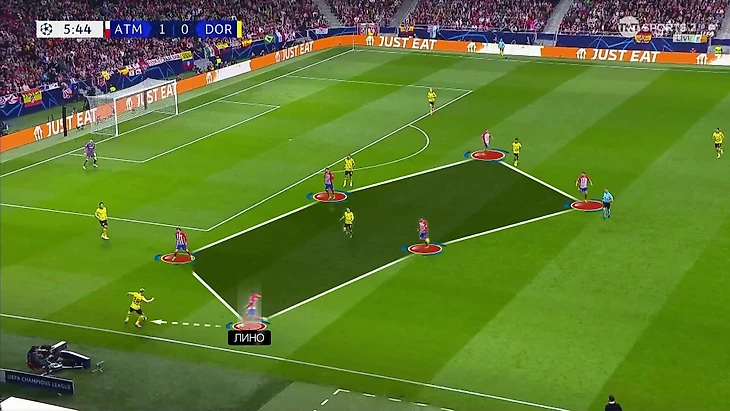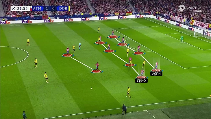 Использование 4-4-2 в большинстве эпизодов лишало крайних защитников привычной подстраховки против скоростных вингеров «Дортмунда». Здесь сильно помогло, что частью плана Симеоне был Аспиликуэта, который играл безупречно. Другой фланг несколько раз вскрыли, а в перерыве уже при 0:2 Чоло перестроился на четкую пятерку.
