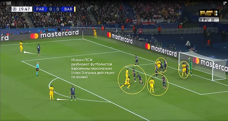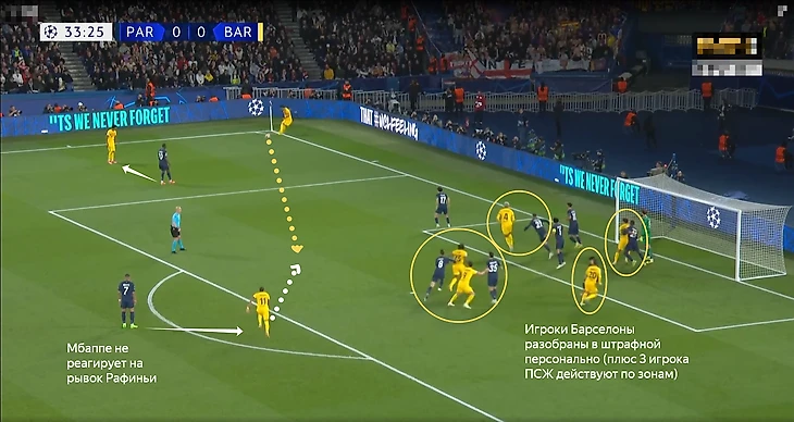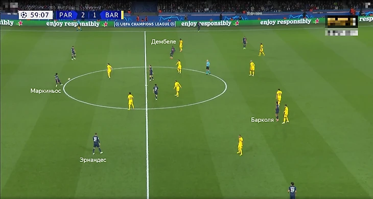 «ПСЖ» использовал зонно-персональную опеку: 5 футболистов разбирали игроков «Барсы», трое действовали по зонам. Мбаппе и Дембеле ориентировались на игроков на подходе к штрафной, что логично, так как и Килиан, и Усман представляют большую угрозу на случай потенциальных контратак.