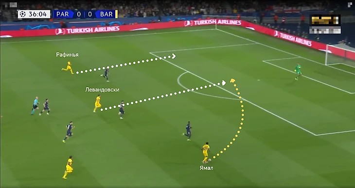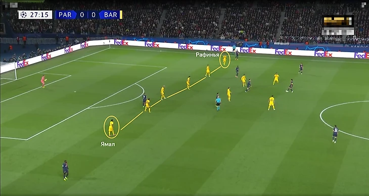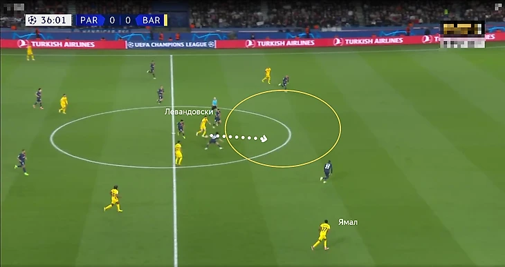 Часто можно было наблюдать ситуацию, когда один из фланговых игроков «Барсы» (Рафинья, Ямал) опускается в оборонительную линию, чтобы помочь противостоять подключениям игроков «Парижа» по флангам. Иногда садились сразу оба – сзади образовывалась шестёрка.