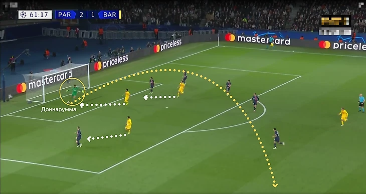 Также отметим то, что привело к данному эпизоду, – прессинг «Барсы», который вынудил не самого хорошо играющего ногами вратаря Доннарумму в спешке выбивать мяч, что привело к потере и атаке каталонцев на ворота «Парижа».
