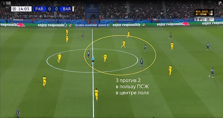 Важный фактор – численное преимущество в центре поля. Без мяча «Барселона» действовала по схеме 4-4-2 (Гюндоган поднимался на одну линию к Левандовскому). За счёт регулярных опусканий Асенсио и Ли Кан Ина в середину поля у парижан часто был перевес против двух опорных полузащитников «Барсы».