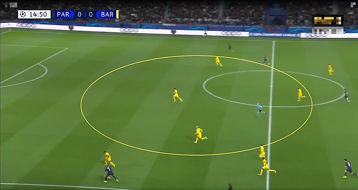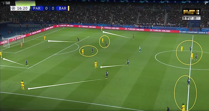 Мы не смогли в полной мере увидеть противостояние коротких розыгрышей и прессинга, так как, опасаясь подставляться под высокое давление соперника, «Барселоны» (зачастую «Париж» тоже) начинала атаки длинными передачами.