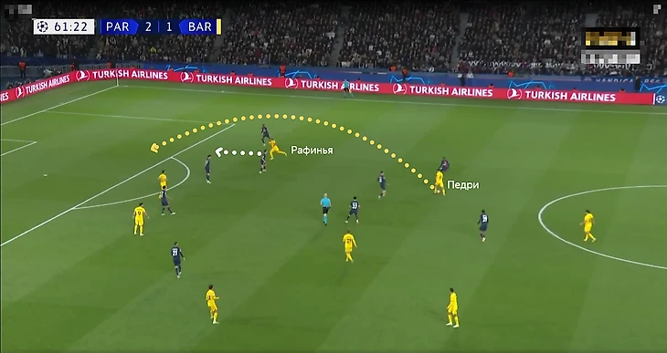 Также это позволило задействовать Гюндогана в более атакующей позиции. Слева в полуфланге появился Рафинья, который в последнее время неплохо адаптировался к этой позиции. Выход бразильца был логичным ходом: против «ПСЖ» каталонцы ожидаемо владели мячом меньше обычного – было важно иметь футболистов, которые готовы и умеют отрабатывать без мяча и не выключаются в прессинге (привет, Феликс!).
