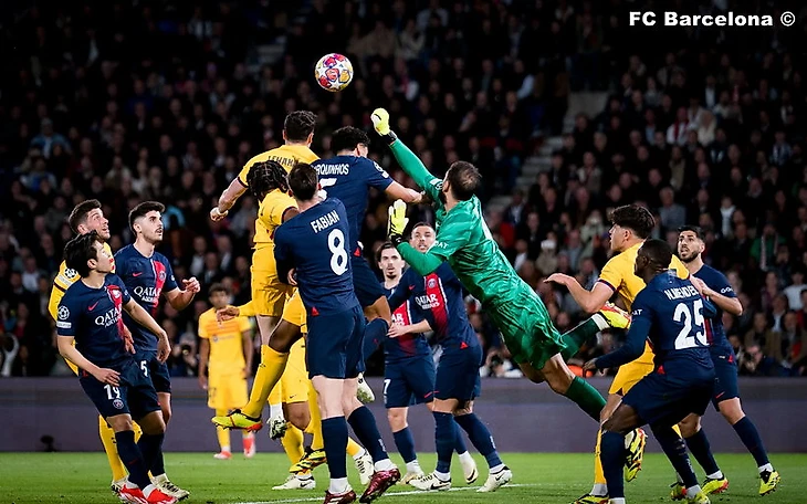 Гостей всё это совершенно не смутило. Быстро стало понятно, что каталонцы, как следует отдохнув перед парижской вылазкой, не выпали из игрового ритма, чего можно было бы опасаться, а совсем наоборот. И важнее всего то, что, в отличие от клубного бюджета, «кулес» не требовалось латать прорехи в обороне. Кубарси, который стал самым молодым защитником в истории ЛЧ, вышедшим в старте на стадии 1/4 финала, и Араухо привычно и уверенно взяли под контроль центральную зону, Канселу слева не давал прохода Дембеле, а справа, где от искр из-под бутс Мбаппе было пожароопаснее всего, за партнером по сборной внимательно приглядывал Кунде. «ПСЖ» накатывал темно-синими волнами на желтый песок на противоположной половине поля, но вода всё никак не задерживалась и с разочарованным шипением возвращалась обратно.