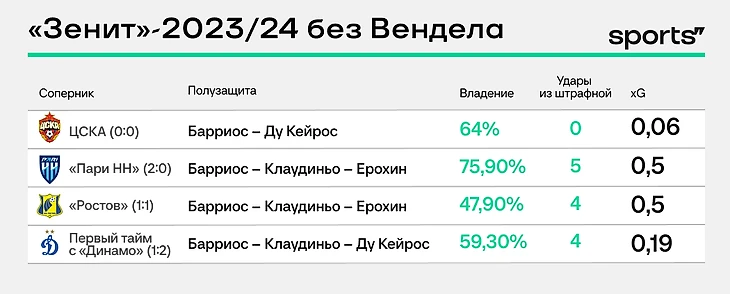 Клаудиньо не заменил Вендела: он слабее в глубинном продвижении и силовом дриблинге под прессингом, полезнее на чужой половине. Плюс без Вендела (и с Клаудиньо в неоптимальной роли) проседала позиция правой восьмерки: