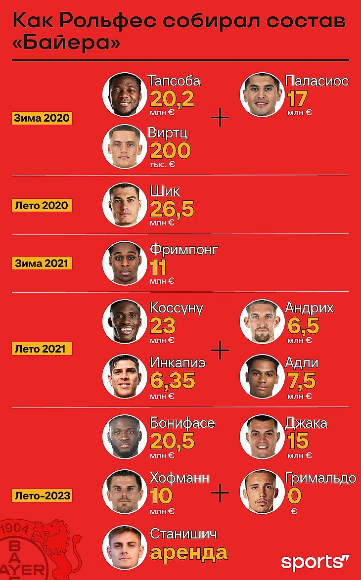 Сегодняшнюю основу «Байера» Рольфес (вместе с Феллером, а также главой скаутского отдела Тимом Штейдтеном до лета 2023-го и шеф-скаутом Кимом Фалькенбергом) собирал шаг за шагом. «Отправной точкой нынешней команды была продажа Кая Хавертца (перешел в «Челси» за рекордные для «Байера» 80 млн евро летом 2020-го – Sports). Стратегия заключалась в том, чтобы вложить деньги за Кая в молодых игроков, которые, как мы верили, когда-нибудь станут топами, таких как Эдмонд Тапсоба, Джереми Фримпонг, Эсекиэль Паласиос и Флориан Виртц. Мы взяли их, зная, что продадим Кая», – объяснил Рольфес на старте этого сезона.