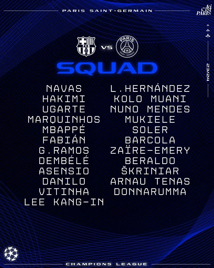 Вот заявка «ПСЖ» на игру против «Барсы»: