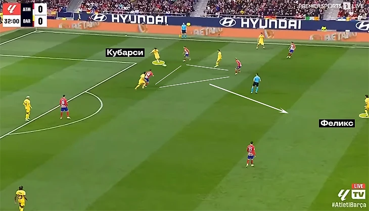 Низом, когда окружает треугольник из прессингующих игроков «Атлетико».