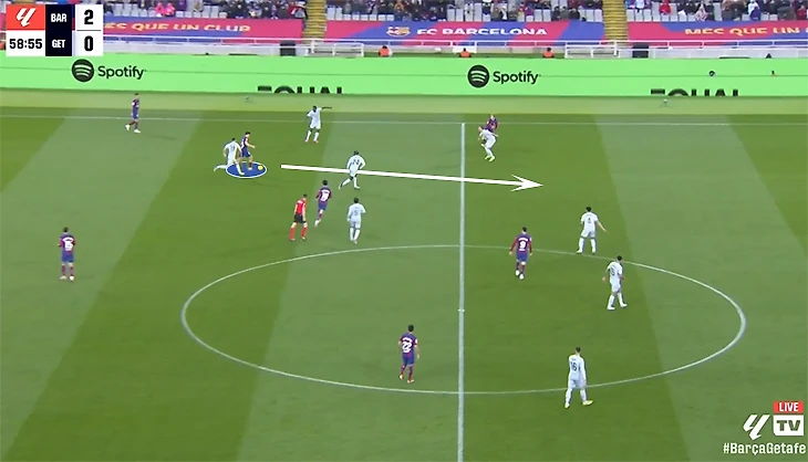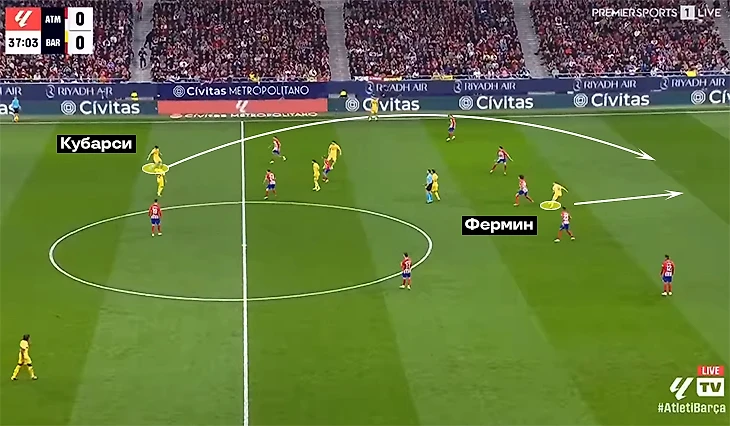 Значимый фактор – система «Барсы»: начинают по 4-4-2, но переходят на 3-2-2-3 за счет высокой позиции крайних защитников. Чаще всего левого. Пау стартует слева в центре и покрывает освободившееся пространство.