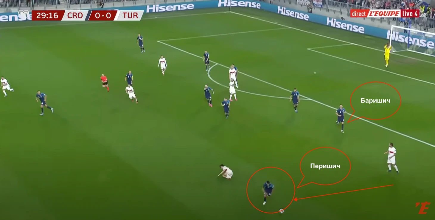 И смотрите, как действует команда: Перишич вырвался на перехват, бросив своего игрока, а Борна Баришич (левый защитник), мгновенно выдвинулся на его позицию (свою же по схеме).