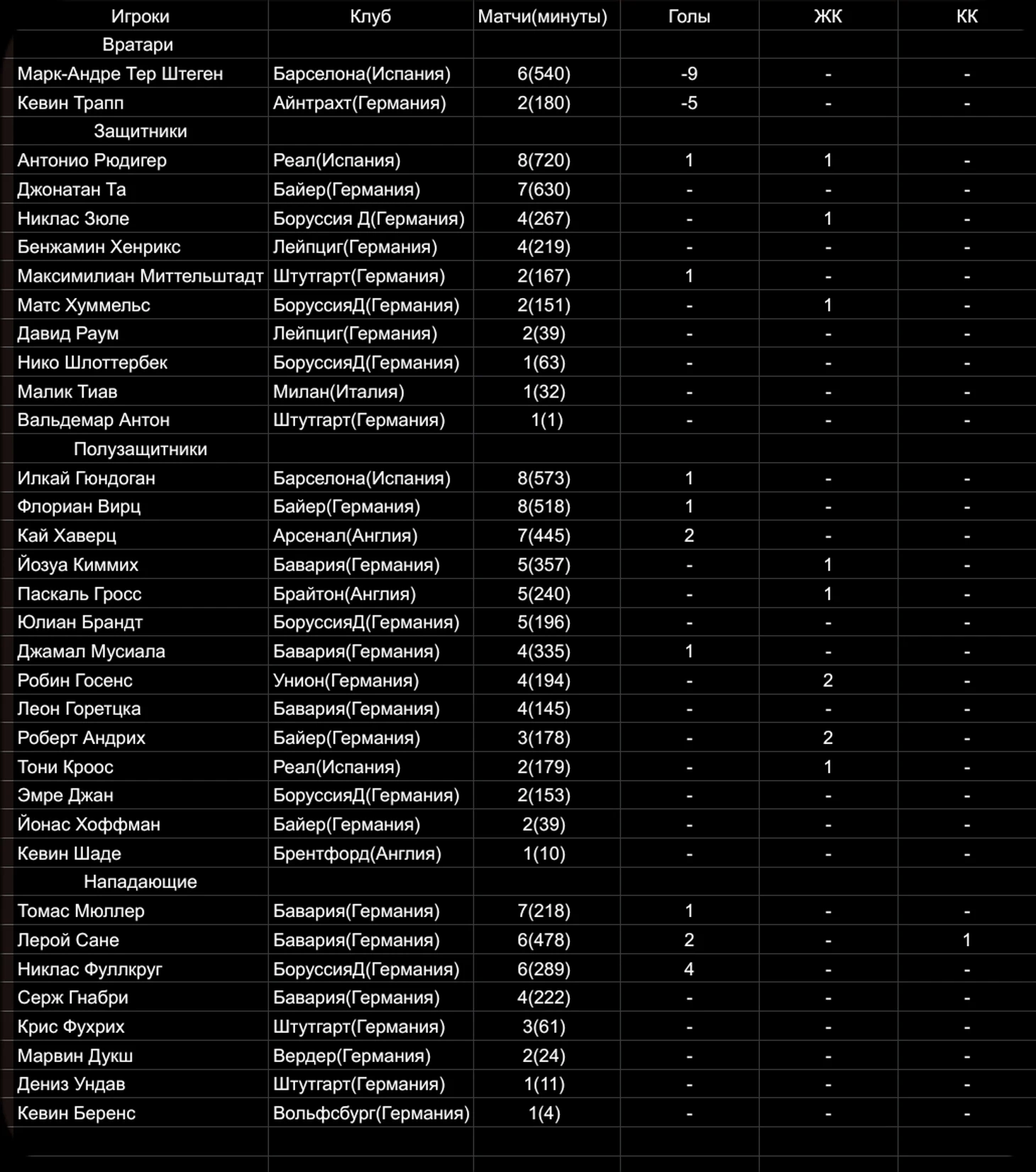 Возможный состав: Нойер - Киммих, Та, Рюдигер, Миттельштадт - Кроос, Гюндоган, Сане, Вирц, Мусиала - Хаверц