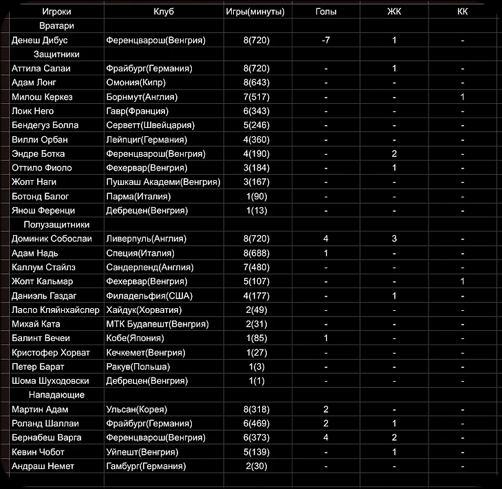 Возможный состав: Дибус - Него, Орбан, Лонг, Салаи, Керкез - Надь, Стайлз, Собослаи - Шаллаи, Варга