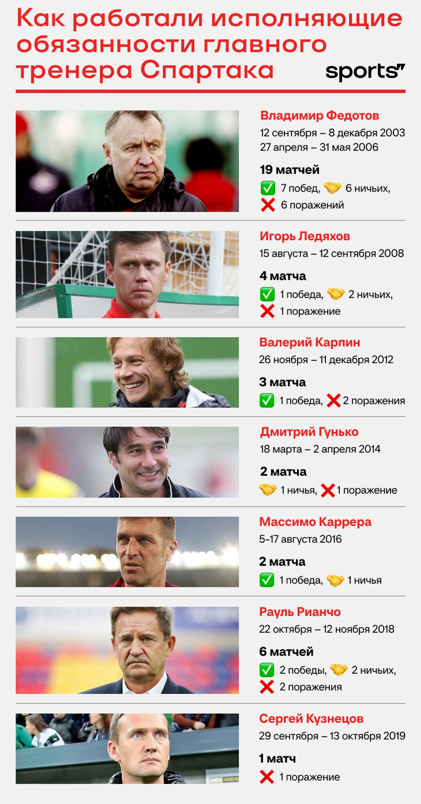 ● Дмитрий Гунько отработал всего два матча как и.о. после увольнения Карпина. «Спартак» в них ничего не забил (0:4 от «Краснодара», 0:0 с «Локомотивом»), но его утвердили главным до конца сезона.