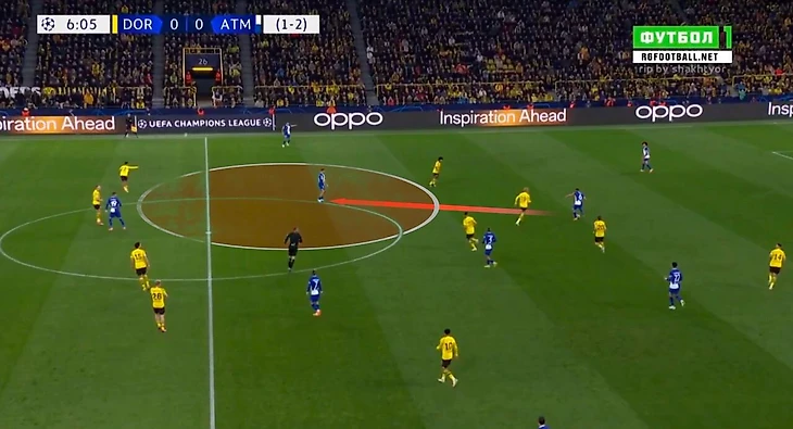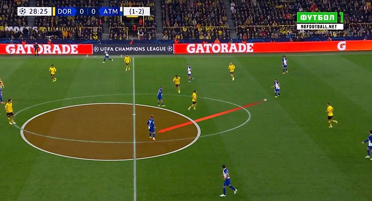 Именно из-за таких дыр «Атлетико» получал кислород, о чем шла речь в первой главе текста. Из-за таких дыр «Атлетико» преодолевал прессинг. «Дортмунд» бежал туда, где мяч, но не перекрывал точки, куда этот мяч пойдет в следующую секунду.