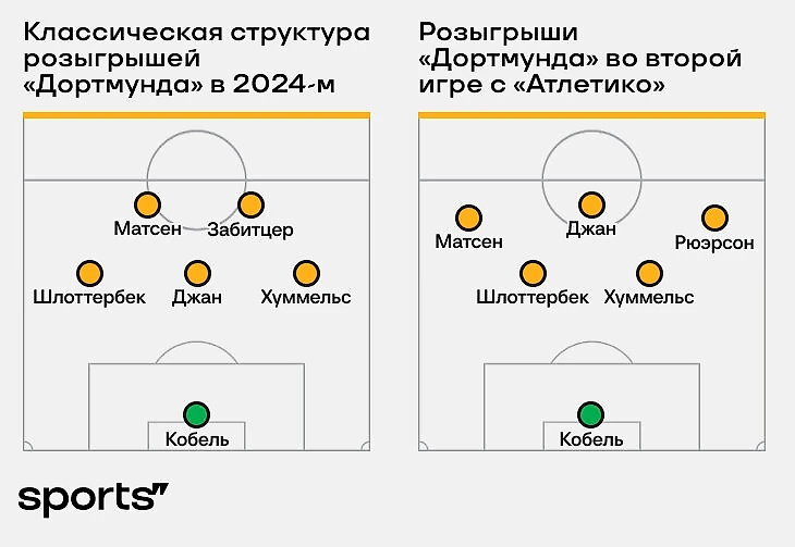 «Атлетико» сразу согласился на игру вторым номером (надежная позиционная защита + контратаки), а «Дортмунд» вышел с непривычной структурой позиционных атак. Обычно разыгрывают в структуре 3+2, но в ответном матче с «Атлетико» выбрали 4+1.