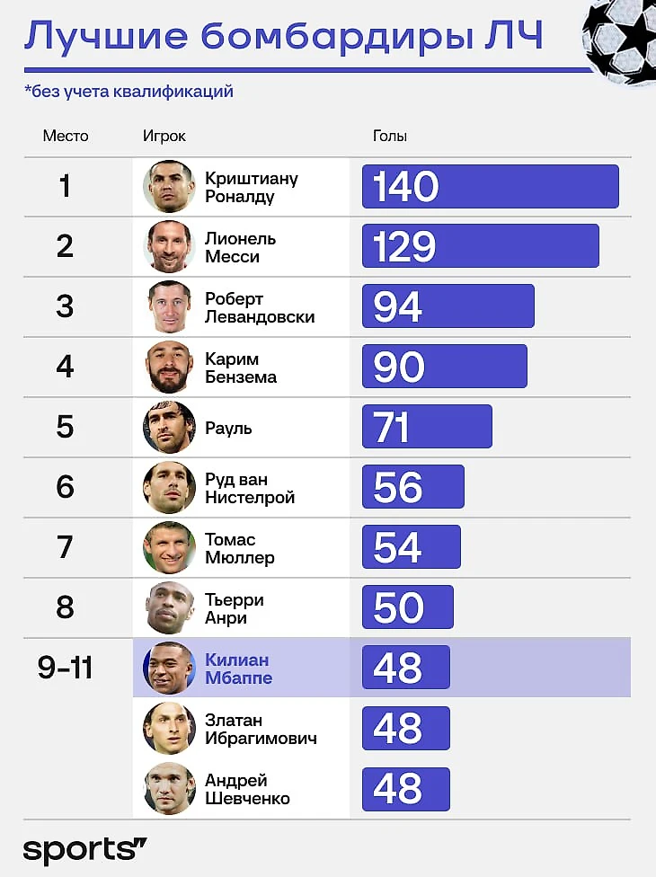 Мбаппе догнал Ибру и Шевченко в топе бомбардиров ЛЧ. И первым в сезоне забил 40 голов