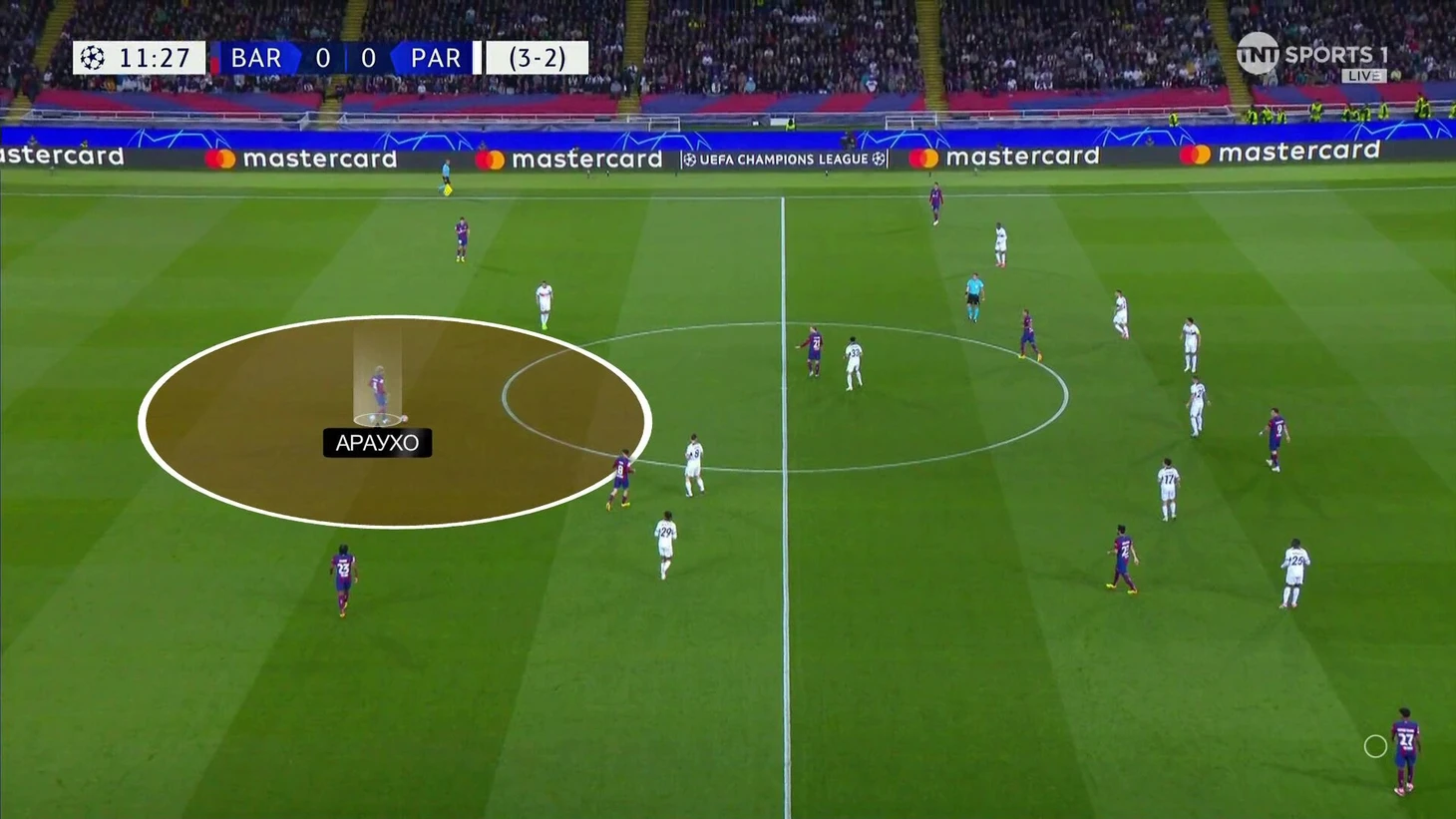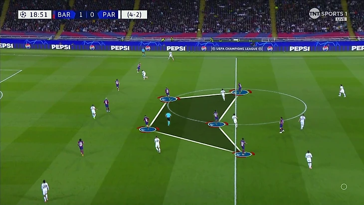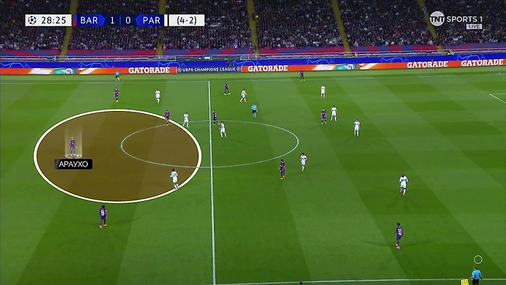 Энрике внес изменения в эту модель давления. Персоналки в прессинге сохранились, но теперь «ПСЖ» оставлял свободным Араухо. Выглядело так: