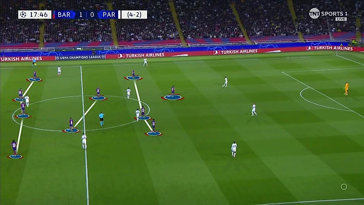 «ПСЖ» придерживался весьма осторожной структуры розыгрышей – без четких высоких позиций крайних защитников. Такая конфигурация оставляла гостям две опции – либо отдавайте за спину в один пас («Барса» была к этому готова – и не оставляла открытый мяч), либо уходить во фланг.