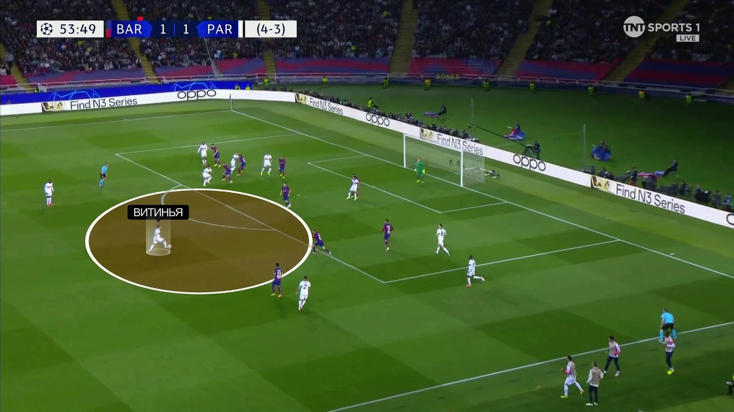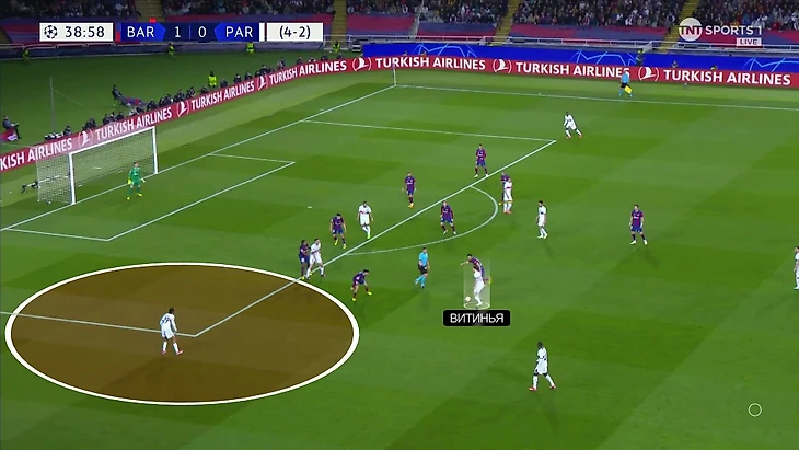 Отдельно нужно похвалить Витинью – он управлял ритмом и атаками парижан. За счет грамотного тайминга и качественных решений португалец улучшал положение команды в позиционных атаках – провоцировал дополнительные провалы у «Барсы» и порой сам же за них наказывал.