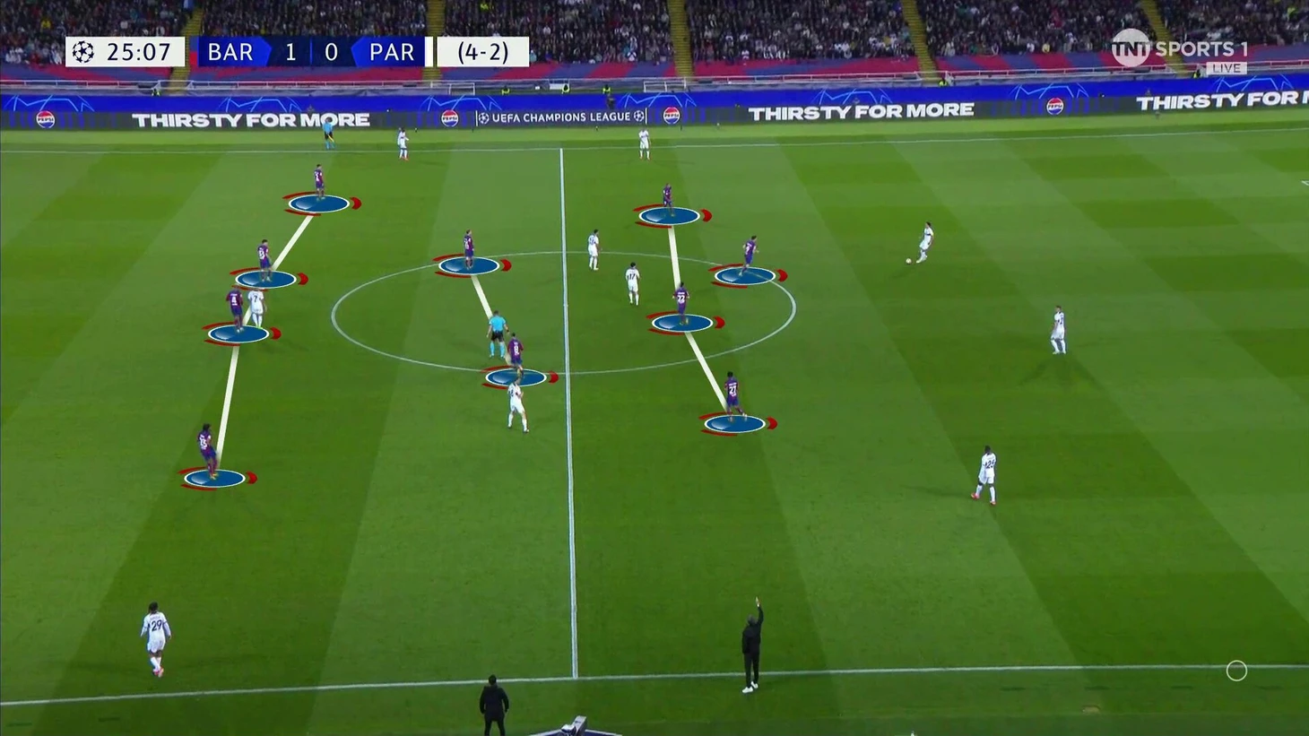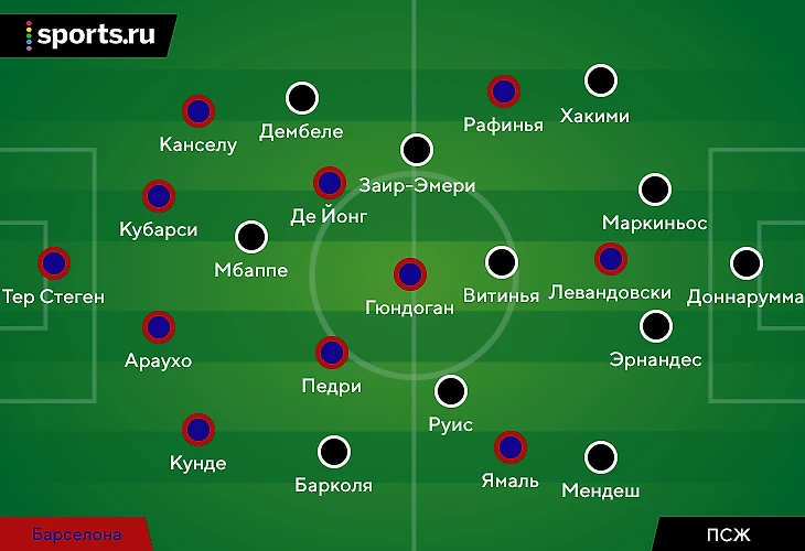 Оба тренера проявили позитивное мышление при выборе состава – на поле не оказалось ни одного акцентированного опорника. Хави стартовал с центром Френки де Йонг/Педри. У «ПСЖ» на правый фланг защиты вернулся Ашраф Хакими, а формальные функции опорника достались Витинье.