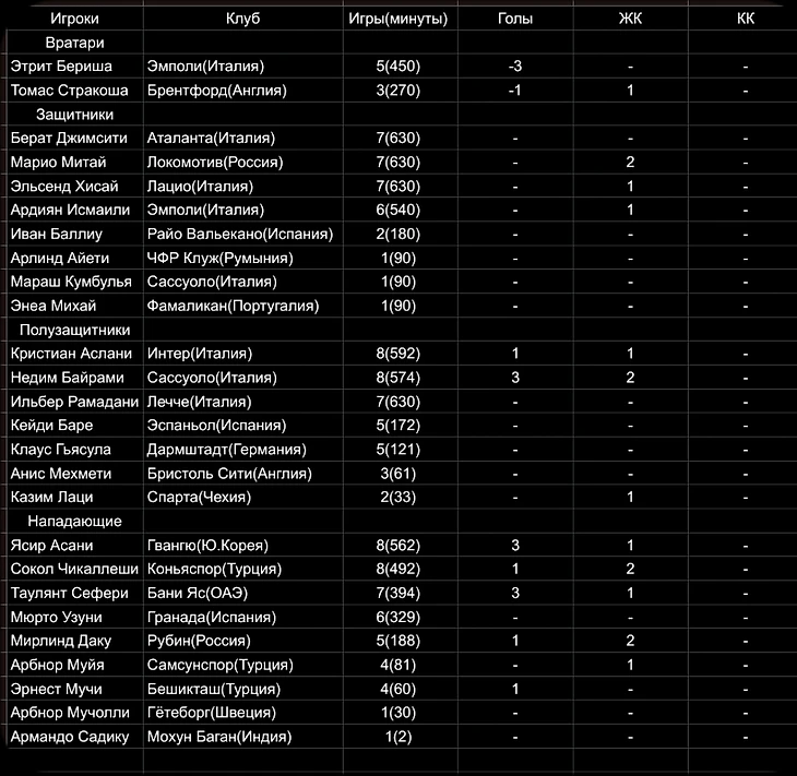 Возможный состав: Бериша - Хисай, Исмаили, Джимсити, Митай - Аслани, Рамадани, Байрами - Асани, Узуни, Чикаллеши