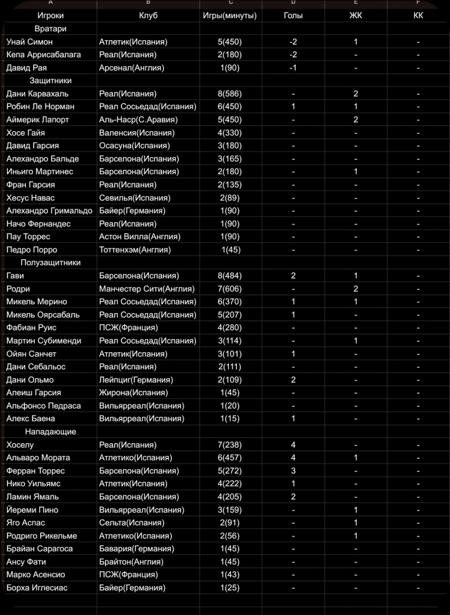 Возможный состав: Симон - Карвахаль, Ле Норман, Лапорт, Гайя(Гримальдо) - Родри, Мерино, Фабиан Руис - Оярсабаль, Ямаль, Мората