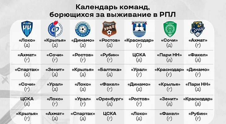 Набрать очки в каждом матче Балтийцам по силам. Краснодар, Динамо, Ростов и Локомотив нестабильны и под конец чемпионата могут потерять мотивацию. Урал в принципиальном матче необходимо обыгрывать. А по опыту последних матчей с ЦСКА можно сделать вывод, что и в нем подопечные Игнашевича способны побороться за максимум результативных баллов. Однако хоть в целом позитивный расклад дает высокий шанс на прямое сохранение прописки в РПЛ, необязательные потери очков по ходу чемпионата могут привести к, на мой взгляд, единственному реалистичному исходу этого сезона - 13 месту и проверке стыками.