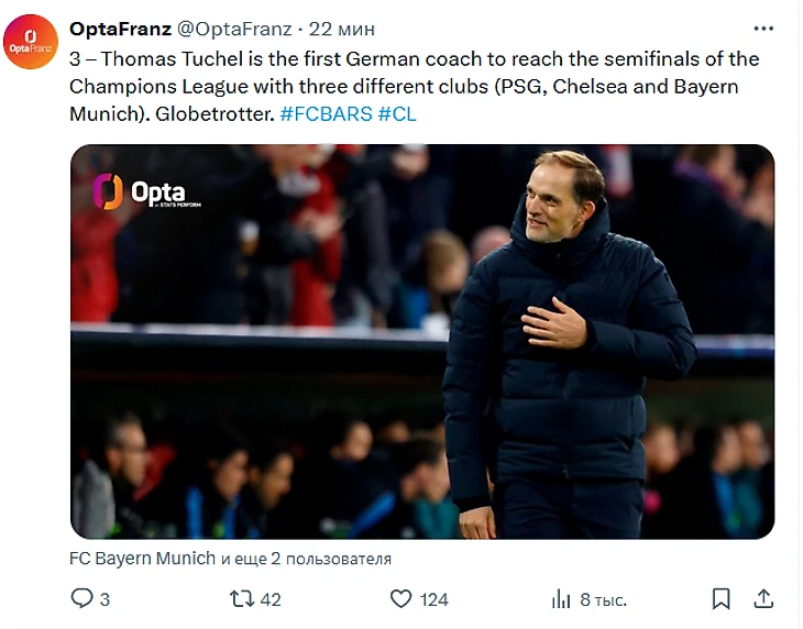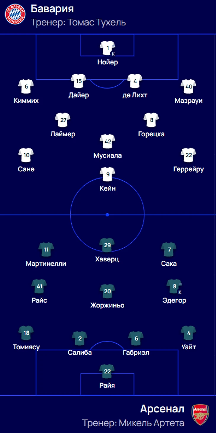 Лондонцы в АПЛ всё ещё борются за чемпионство, однако проиграли матч против «Астон Виллы» в последнем туре, а «Бавария» в тяжёлом матче в выходные обыграла «Кёльн», но титул чемпиона впервые за 11 лет уступила леверкузенскому «Байеру». Помимо этого в Мюнхене эпидемия травм, и выбыли из строя и Гнабри, и Коман, а у Дэвиса перебор жёлтых карточек, у «Арсенала» таких проблем с составом нет.