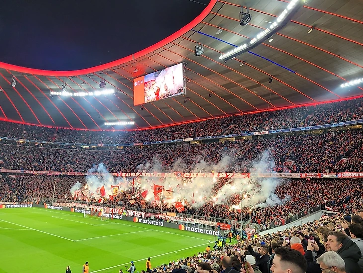 Болельщики устроили огненный перфоманс, ведь для мюнхенцев этот четвертьфинал - буквально матч жизни.