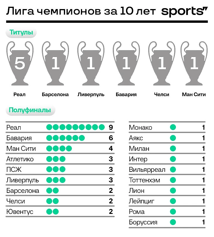● За десять лет «Реал» выиграл пять титулов. У остальных («Барселона», «Ливерпуль», «Бавария», «Челси» и «Ман Сити») – максимум один!
