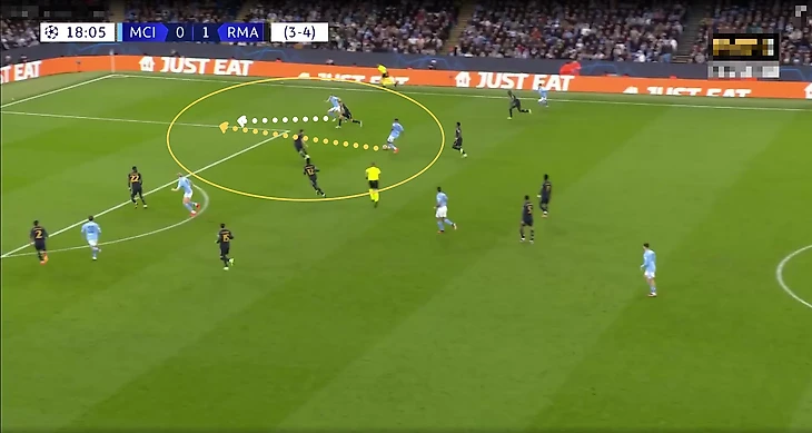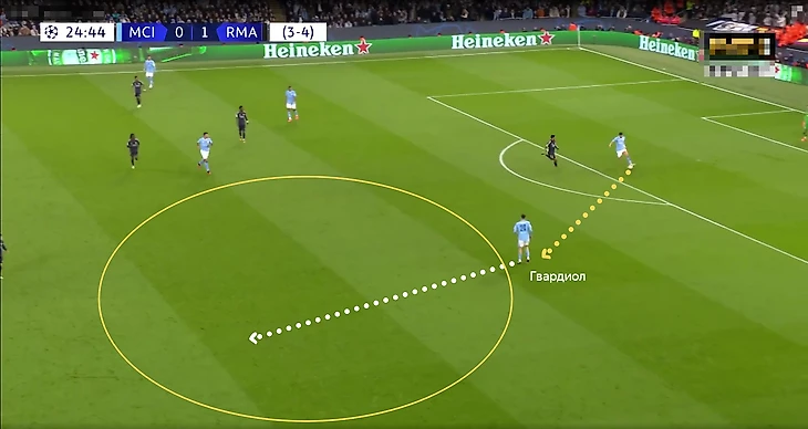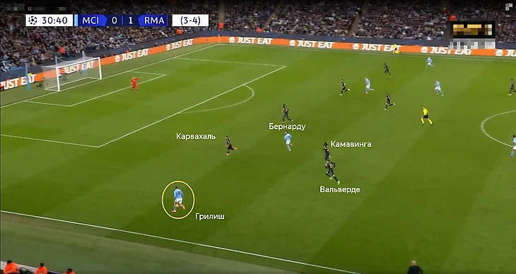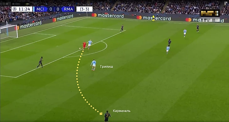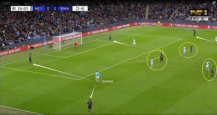 В прессинге команда Гвардиолы стремилась перекрывать все варианты в центре, а слева у Грилиша была двойная ориентировка: англичанин должен был реагировать на центрального защитника Рюдигера и правого защитника Карвахаля.