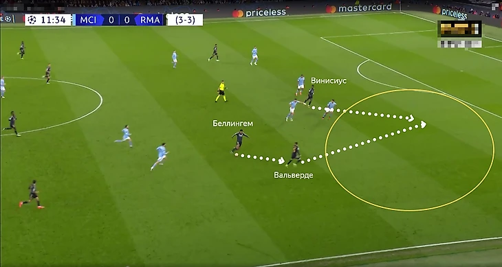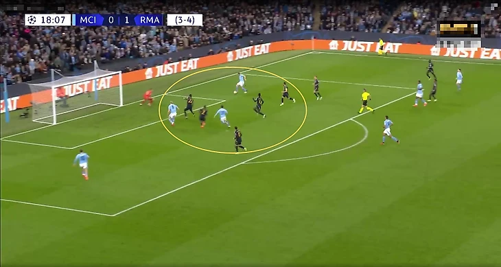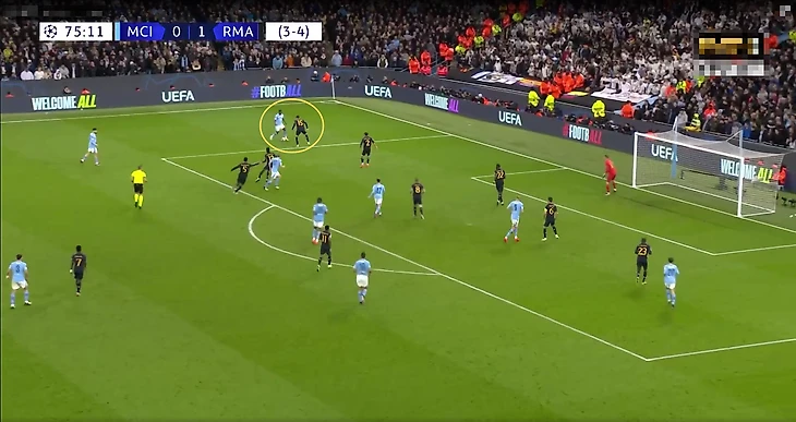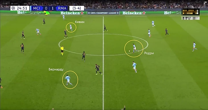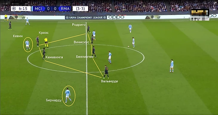Также регулярно англичане имели численное преимущество в центр поля, где «Мадрид» часто оставлял много свободного пространства. Кроос и Камавинга отвечали за Де Брюйне и Бернарду – восьмёрки «Сити» могли манипулировать соперником и уводить их ближе к флангам, что оставляло свободу, например, Родри, который мог спокойно развивать атаку, как вот в этом эпизоде.