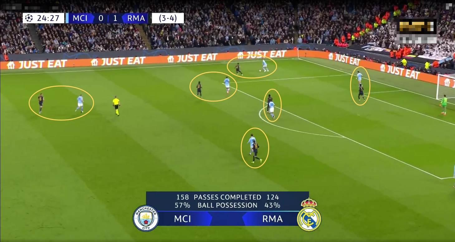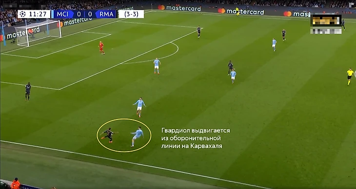 В прессинге команда Анчелотти часто старалась плотно давить на левом фланге, но свобода оставалась справа. Например, здесь игроки «Реала» персонально разбирают футболистов соперника в одной части поля, но через небольшой промежуток времени «Манчестер Сити» выходит из-под давления через свободного Гвардиола на противоположном краю.