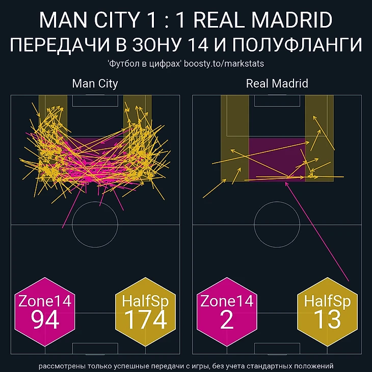 Картинка, иллюстрирующая количество передач в полуфланги и зону перед штрафной, просто ужасает – сумасшедший разрыв в цифрах.