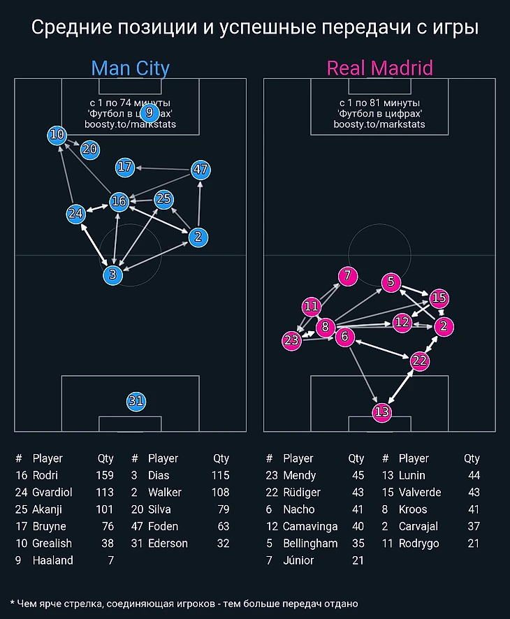 Карта усреднённых позиций показывает тотальность доминирования сити. «Реал» припарковал самый настоящий автобус. По-другому это сложно назвать – 57% от всех своих действий команда Анчелотти совершила в оборонительной трети. У «Сити» – 48% в атакующей.