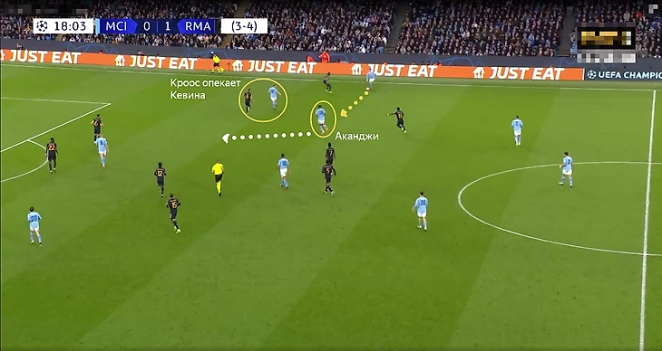 Если Де Брюйне уходил ближе к краю, то Кроос в большинстве случаев следовал за ним, из-за чего образовывалась свободная зона в центре поля, которую мог заполнять Аканджи. Такими действиями «Сити» неоднократно создавал опасность у чужих ворот. Например, момент с попаданием Холанда в перекладину – результат подобного эпизода.