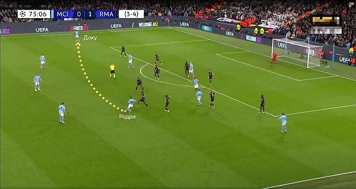 Весь «Реал» за линией мяча (что было характерно по матчу), Родри переводит на фланг на Доку. Бельгиец идёт в дриблинг и простреливает.
